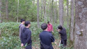 ㈱minotake様所有の山林にて、現地を歩きながら報告者より山林経営について学ぶ。